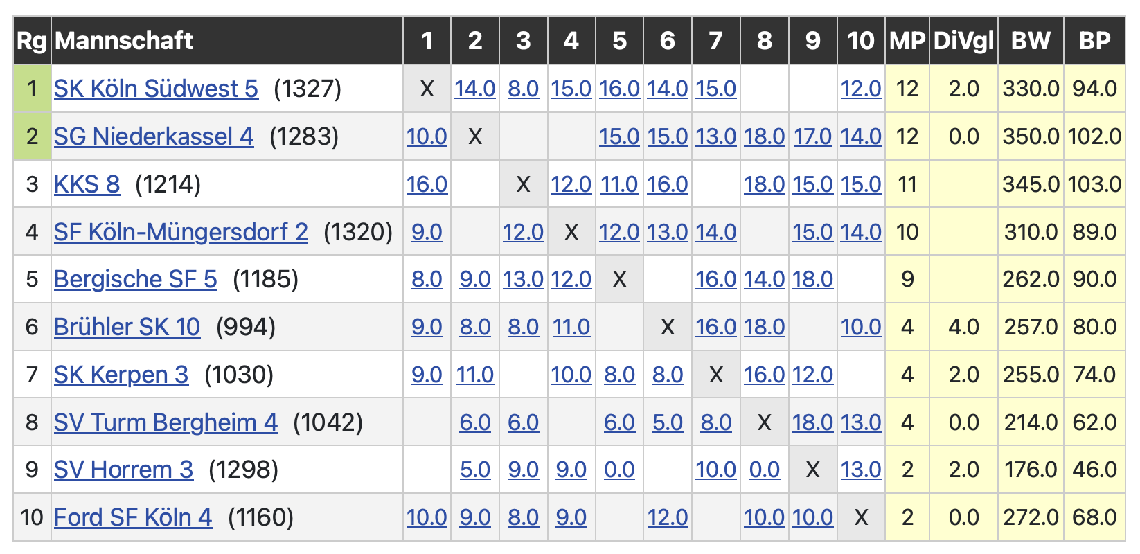 Doch egal, wir hatten zu dem Zeitpunkt bereits gewonnen. Nach diesem Mannschaftserfolg stehen wir weiter auf einem Aufstiegsplatz: mit 12 Punkten, punktgleich mit dem Ersten. In den letzten beiden Runden treffen wir auf die beiden direkten Verfolger, und zwar zunächst am 21.4. auswärts gegen KKS 8, die uns auf dem 3. Tabellenplatz mit 11 Punkten dicht auf den Fersen sind.