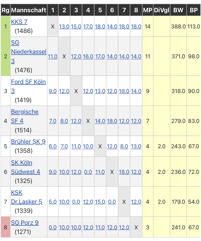 Damit erreichten wir einen sicheren 4:2-Sieg, der den zweiten Platz in der Liga und den Aufstieg sicherte. Daran hätte letzten Endes sogar eine Niederlage nichts geändert, da unser Verfolger in seinem eigenen Wettkampf gegen die Bergischen Schachfreunde nicht über ein Unentschieden hinauskam.