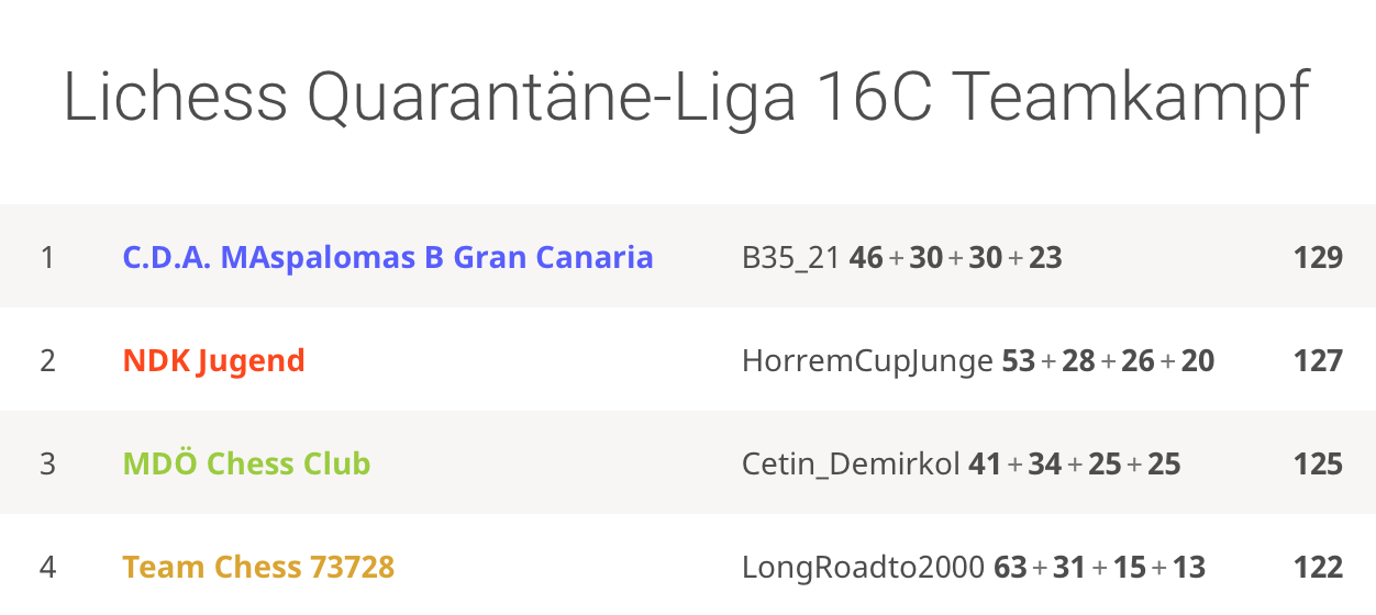 Leider sind wir nach zwei Aufstiegen in Folge erstmals wieder abgestiegen in der Lichess Quarantäne-Meisterschaft. Liga 15 war einfach zu stark, zumal drei unserer besten Spieler (Charlie, Henri und Yannick) fehlten. So war der Abstand auf einen Nicht-Abstiegsplatz am Ende mit 36 Punkten riesig. Nur Martin (40 Punkte) und Jonte (25) konnten mit den Gegner*innen mithalten, die meist eine Wertungszahl von 1900+ hatten. In die Mannschaftswertung kamen noch Helen (10) und Paul (9). Schade, aber da war einfach nichts zu machen! Hoffen wir nun, dass wir am Donnerstag in Liga 16 wieder neu angreifen können und dann auch wieder ein stärkeres Team zusammen bekommen. Glückwunsch aber an unsere erste Mannschaft zum Wiederaufstieg! Damit erhöhen sie den Abstand zu uns auf 10 Ligen. ;-)